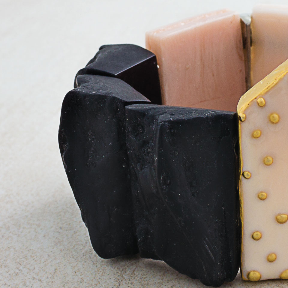Étain sculpté main, or ou bronze, parfois paré avec une fluidité captivante. Nuances profondes et colorées. Magnétiques.